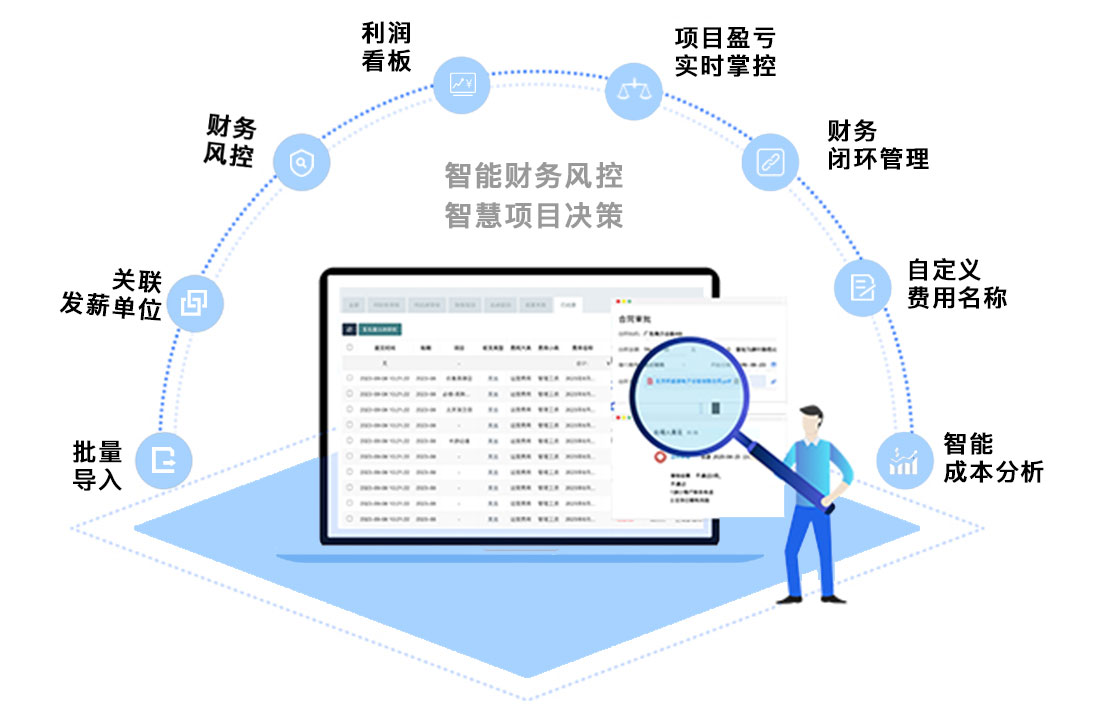 账期、项目、业务主体维度的财务收支管理,项目盈亏实时掌控。支持批量导入、审批、出账管理等。关联员工薪资、渠道费、预支等项目支出,审核下发关联发薪单位。