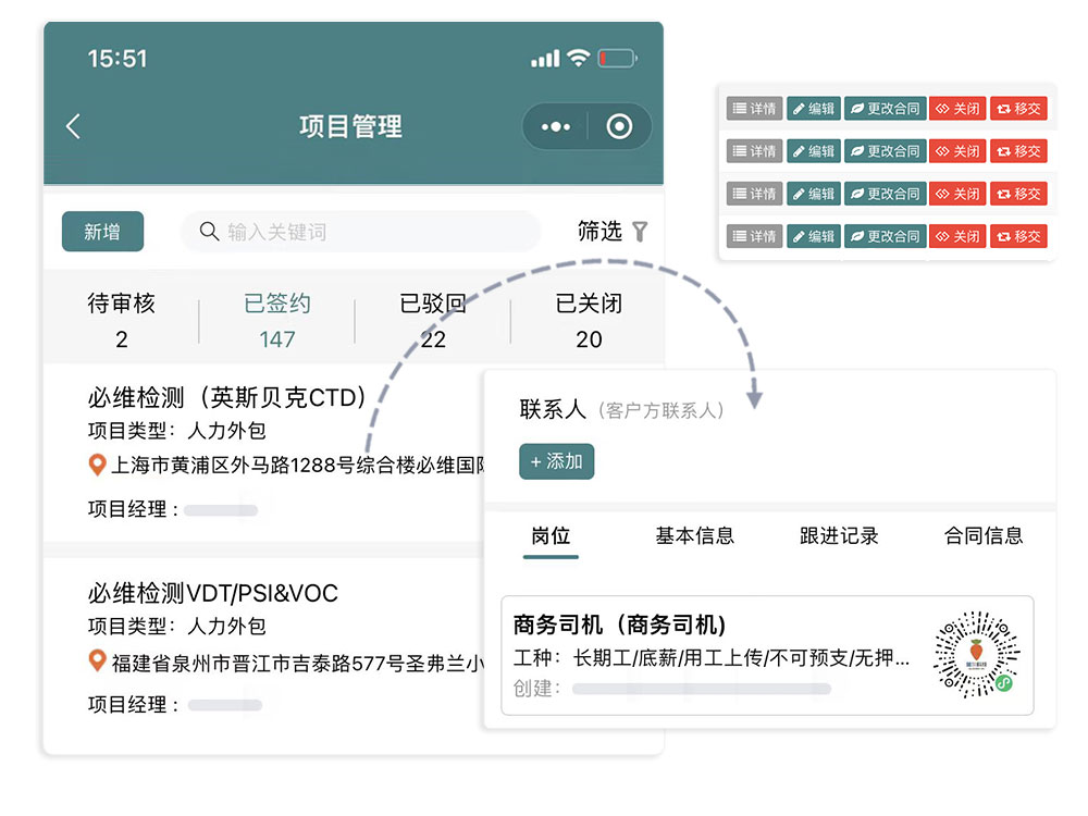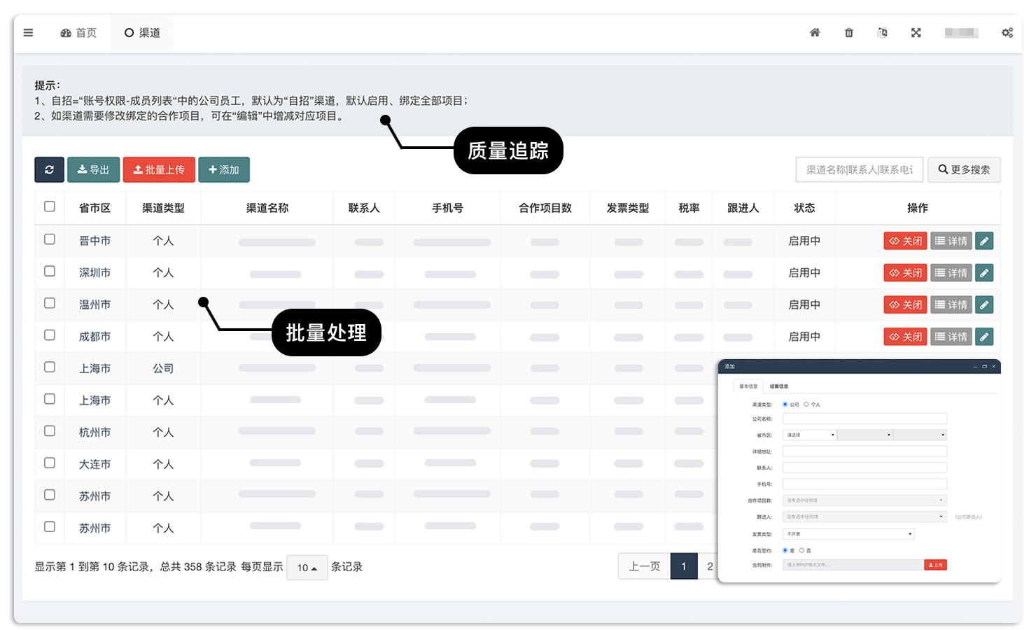 支持多种劳务渠道单个、批量添加和管理维护,通过绑定、解绑关联项目及员工。
