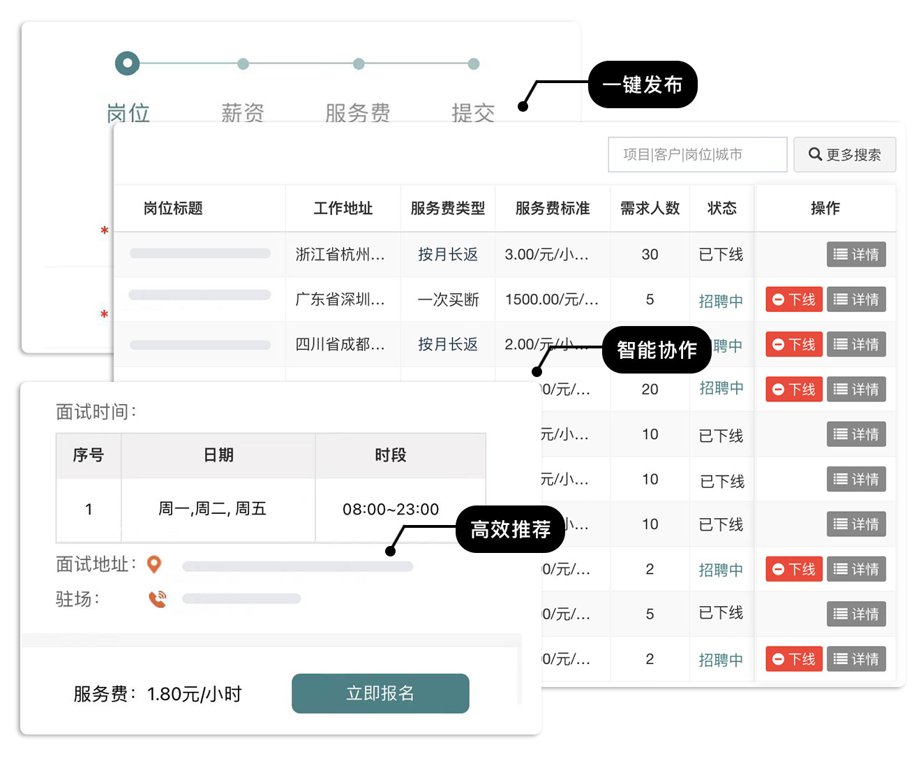 整合全国各区域的大小劳务经纪中介,实现人力信息和资源线上化;汇集人资服务商所有用工需求,将用工需求、用工管理数字化;为人资服务商、劳务经纪创造一个专业网络,让他们在平台上建立协同合作。