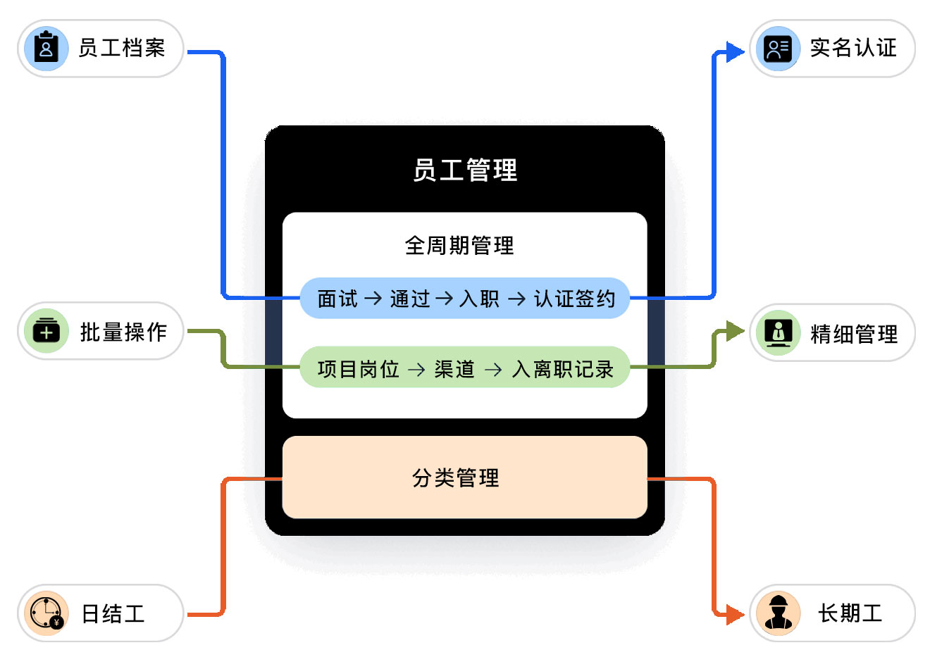 面试、通过、签约、入职、离职”员工全周期管理,长期工、日结工分类管理。