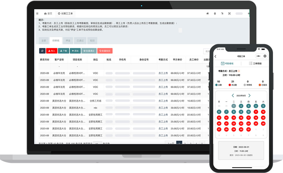兼容多种考勤方案(打卡签到、员工上传、用工上传),支持劳动工时、计件、底薪加绩效多种核算工价方式。